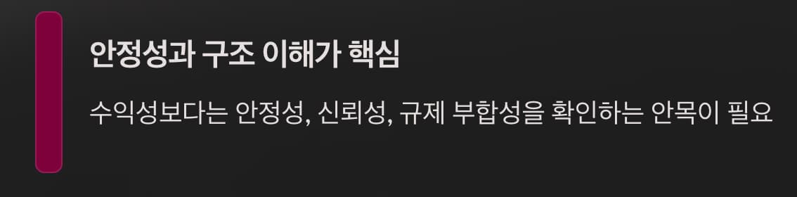 수익성보다는 안정성과 구조 이해가 가장 중요한 기준이 되어야 하며,