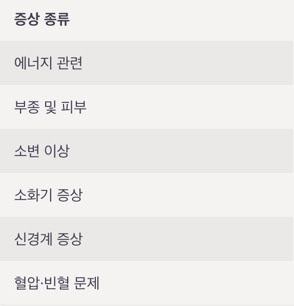 | 에너지 관련 | 만성 피로, 무기력, 집중력 저하 |