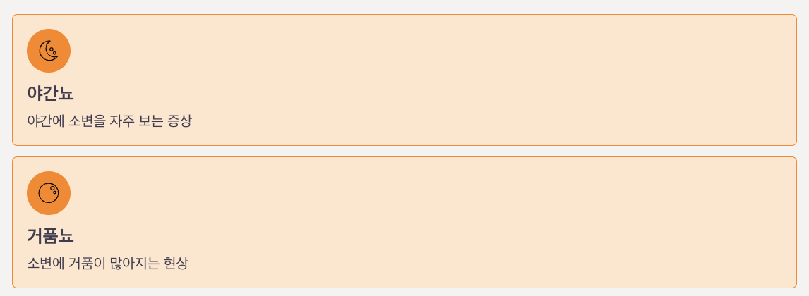 | 소변 이상 | 야간뇨, 거품뇨, 혈뇨, 소변량 변화 |