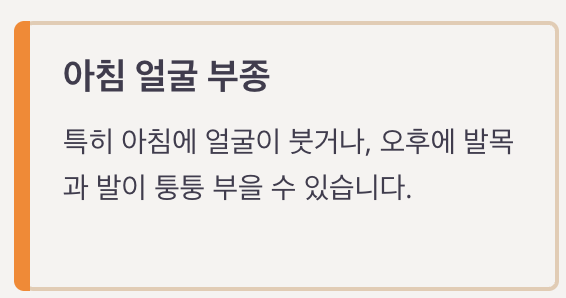 특히 아침에 얼굴이 붓거나, 오후에 발목과 발이 퉁퉁 부을 수 있습니다.