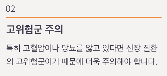 특히 고혈압이나 당뇨를 앓고 있다면 신장 질환의 고위험군이기 때문에 더욱 주의해야 합니다.