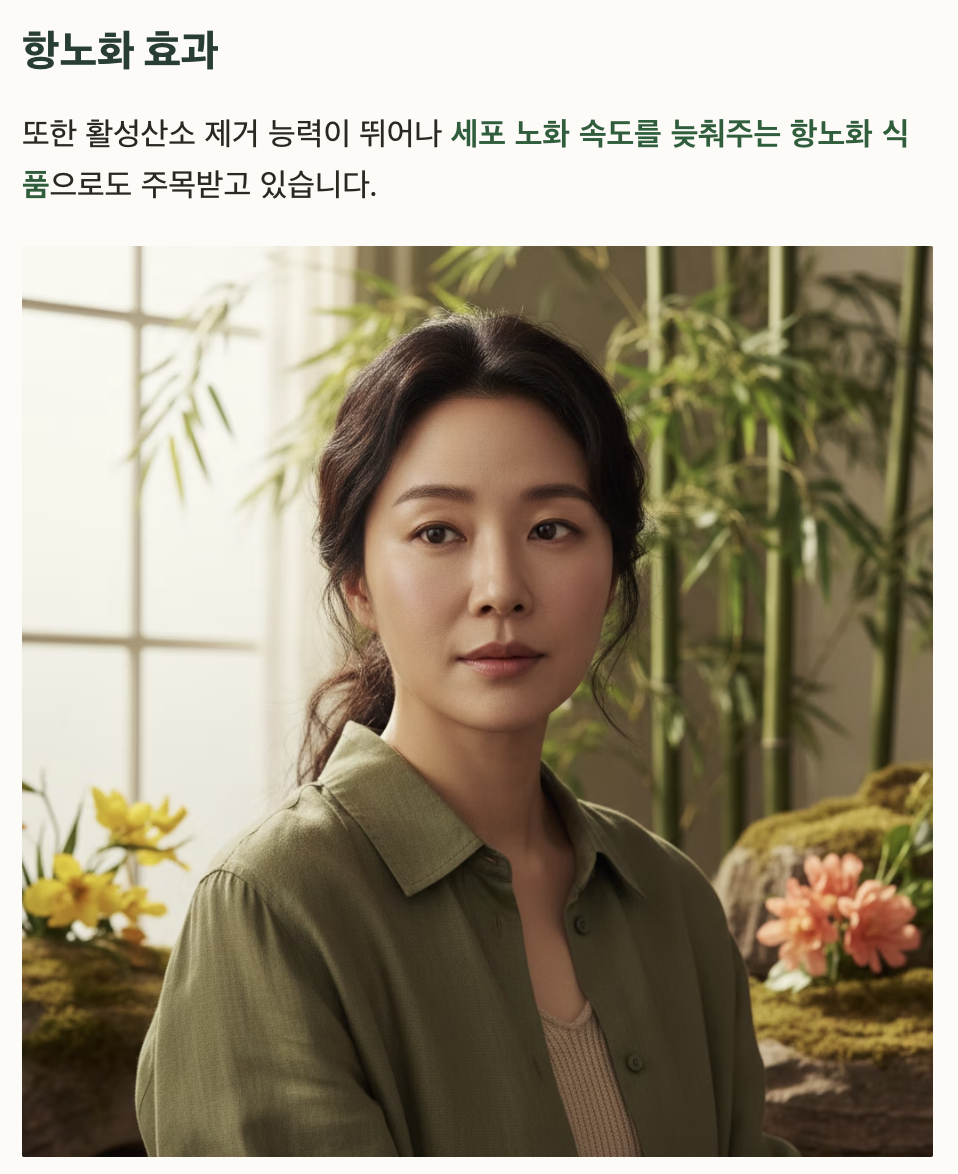 또한 활성산소 제거 능력이 뛰어나 세포 노화 속도를 늦춰주는 항노화 식품으로도 주목받고 있습니다.