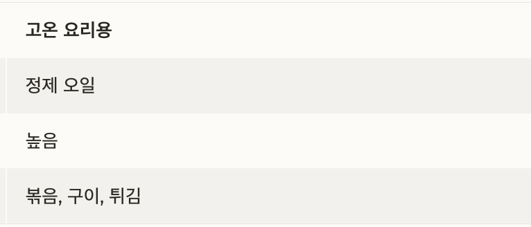 - 발연점: 정제 오일은 고온 요리에, 비정제는 드레싱에