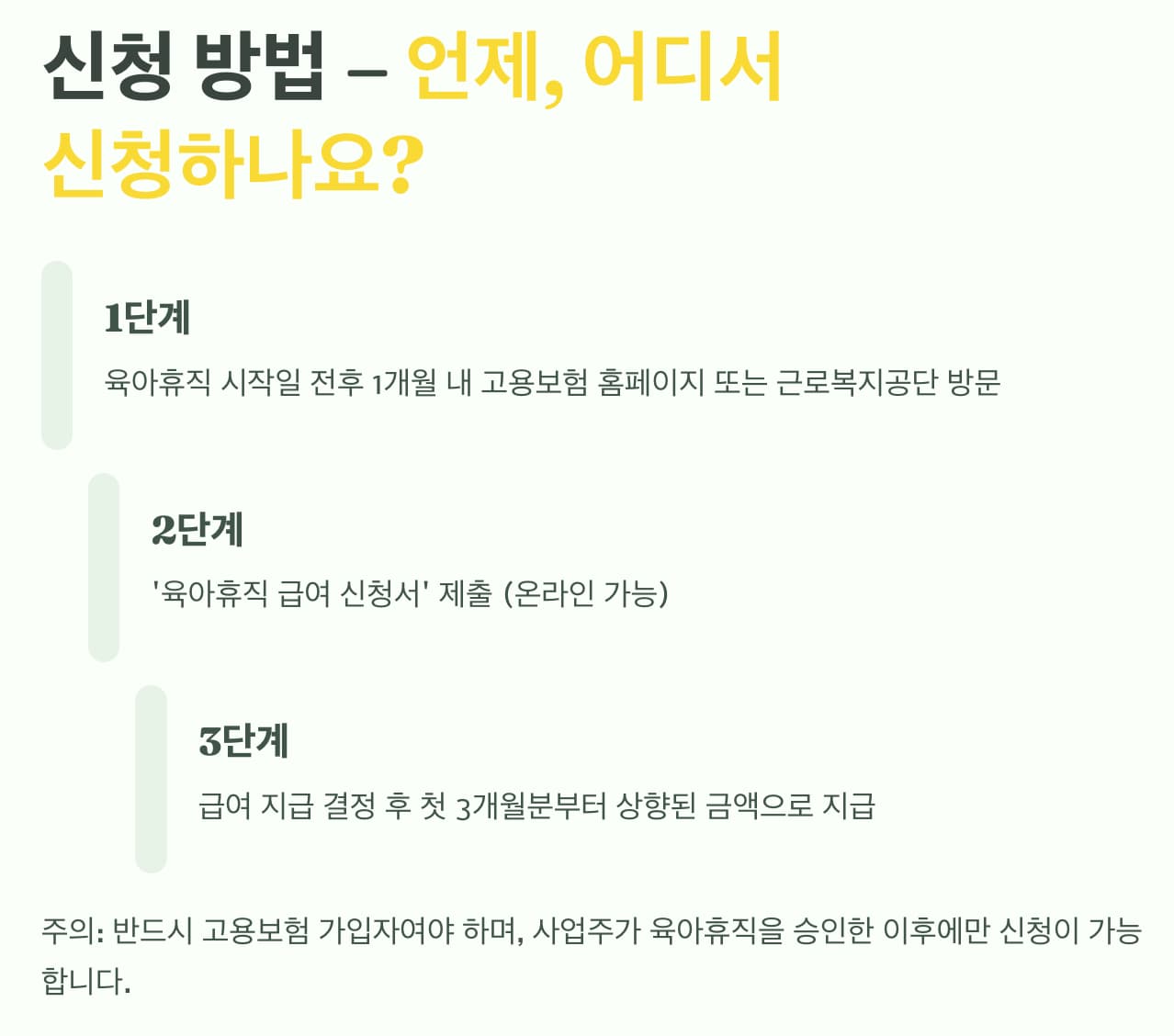 주의: 반드시 고용보험 가입자여야 하며, 사업주가 육아휴직을 승인한 이후에만 신청이 가능합니다.