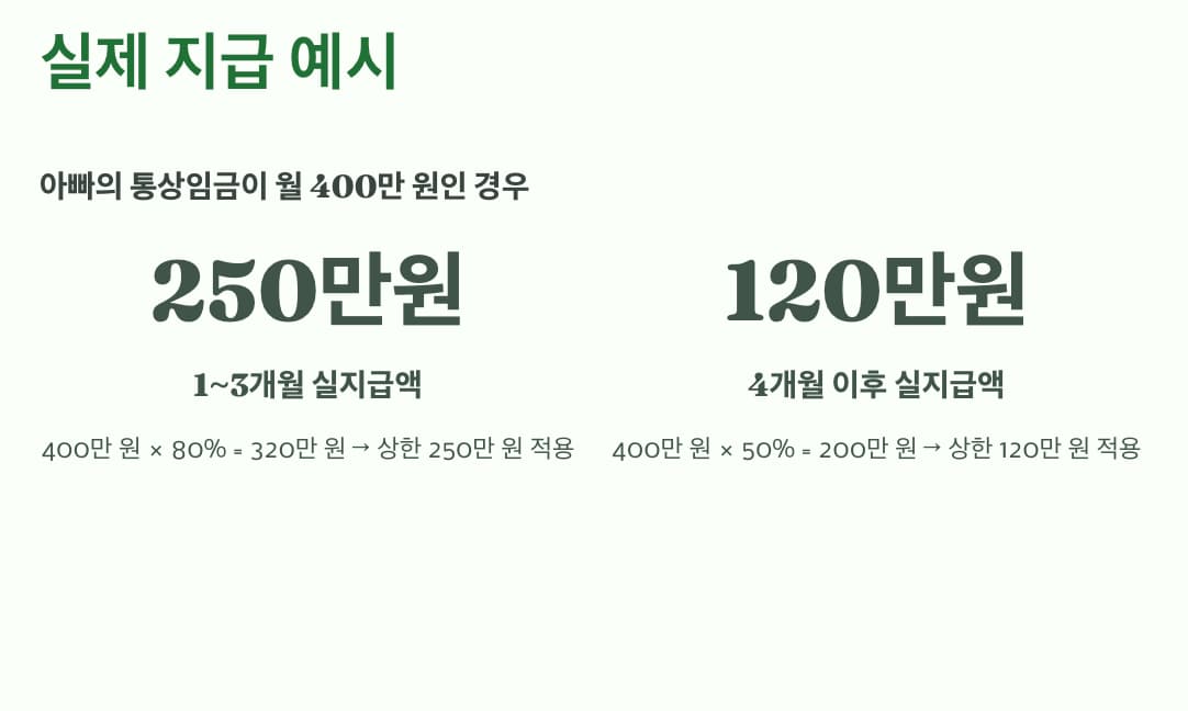 | 1~3개월 | 400만 원 × 80% = 320만 원 → 상한 250만 원 적용 | 월 250만 원 × 3개월 = 750만 원 |