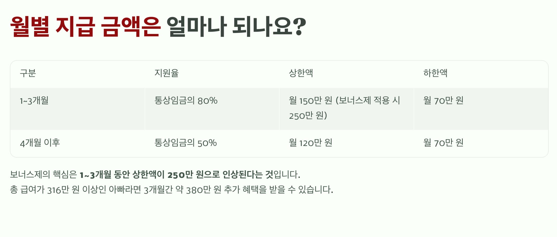 | 1~3개월 | 통상임금의 80% | 월 150만 원 (보너스제 적용 시 250만 원) | 월 70만 원 |