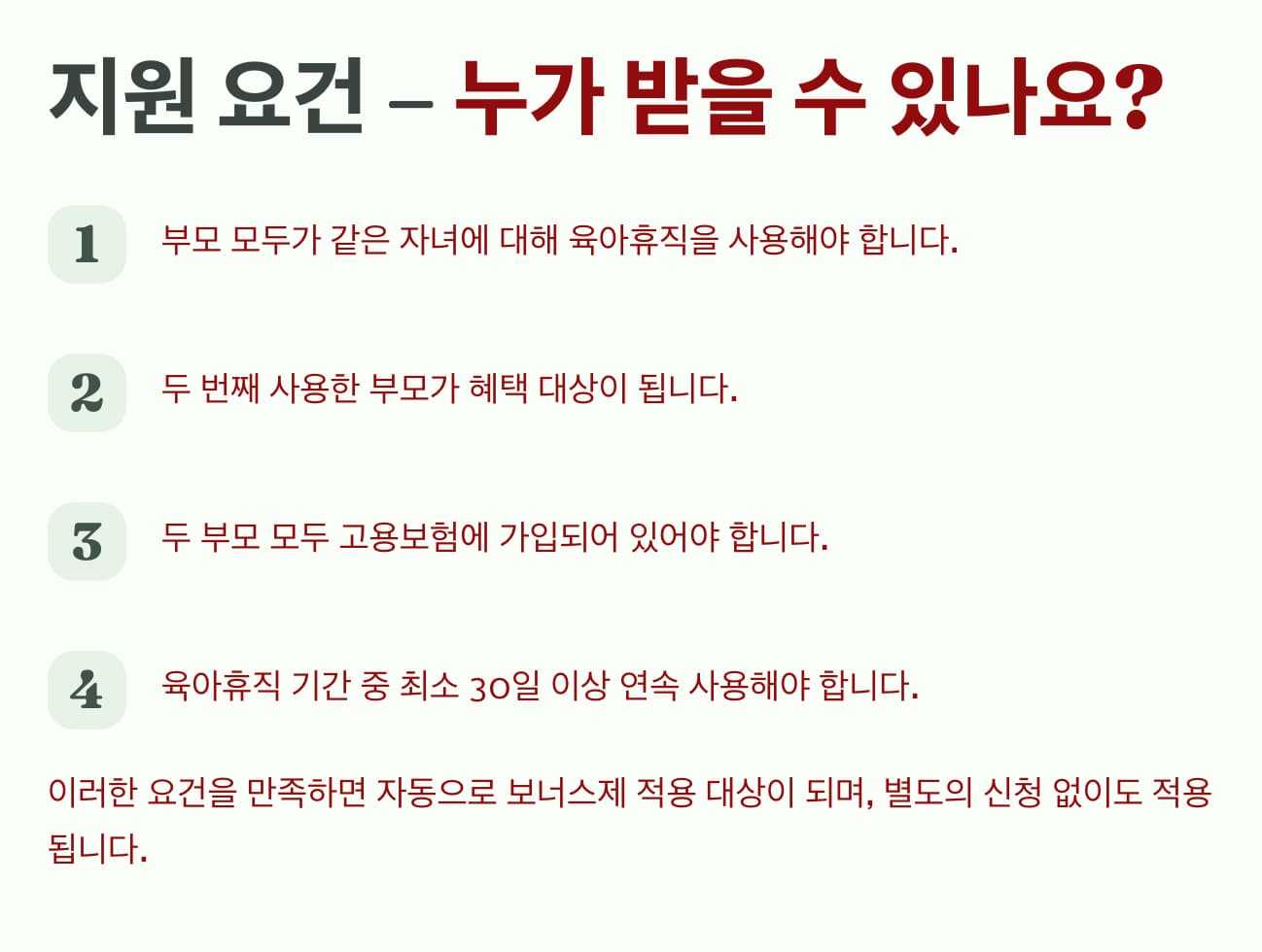 | 지원대상 | 동일 자녀에 대해 부모 모두 육아휴직 사용 시 두 번째 사용한 부모 |