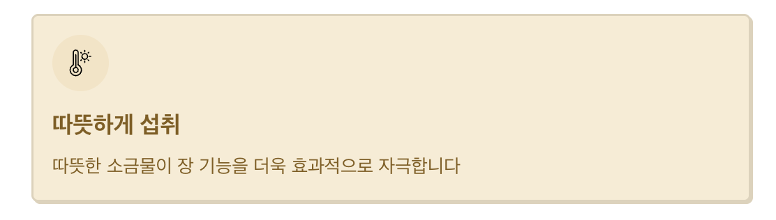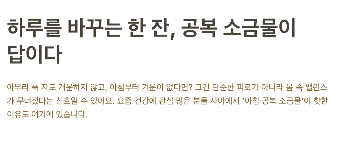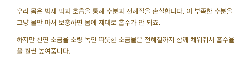 하지만 천연 소금을 소량 녹인 따뜻한 소금물은 전해질까지 함께 채워줘서 흡수율을 훨씬 높여줍니다.