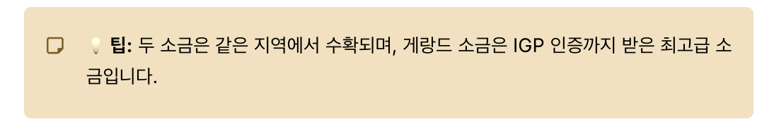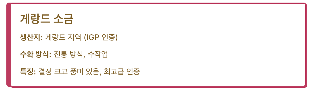 | 생산지 | 프랑스 브르타뉴 해안 | 게랑드 지역 (IGP 인증) |