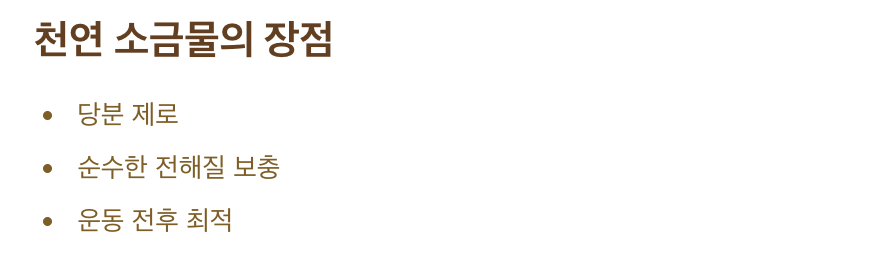 천연 소금물은 당 없이 순수하게 전해질만 보충하므로, 운동 전후로 마시기 딱 좋습니다.