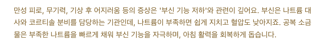 부신은 나트륨 대사와 코르티솔 분비를 담당하는 기관인데, 나트륨이 부족하면 쉽게 지치고 혈압도 낮아지죠.