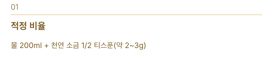 - 물 200ml + 천연 소금 1/2 티스푼(약 2~3g)