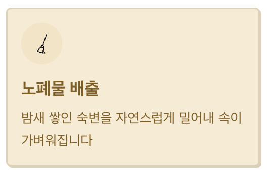 아침 공복에 마시면 밤새 쌓인 숙변을 자연스럽게 밀어내면서 속이 한결 가벼워지는 느낌을 받을 수 있어요.