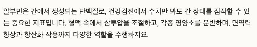 알부민은 간에서 만들어지는 단백질로, 간 건강의 바로미터 역할을 합니다. 수치가 낮으면 간세포 재생력이 떨어지고, 독소 배출 능력도 감소할 수 있습니다.