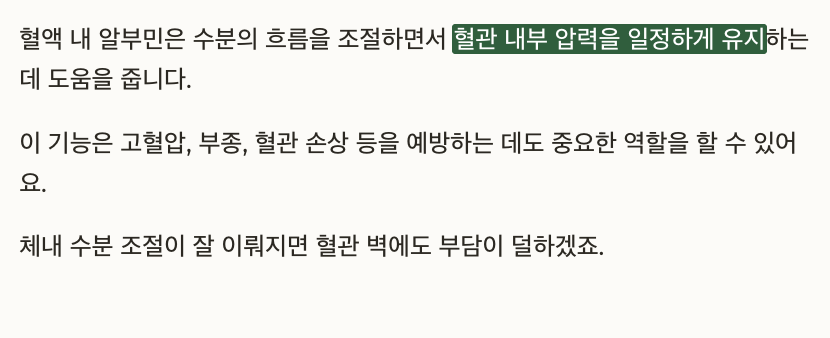알부민은 혈관 안에 체액이 빠져나가지 않도록 잡아주는 역할을 합니다. 삼투압이 유지되어야 조직과 혈관 사이의 균형이 맞춰지거든요.