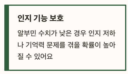 연구에 따르면 알부민이 낮은 경우 인지 저하나 기억력 문제를 겪을 확률이 높아질 수 있어요.