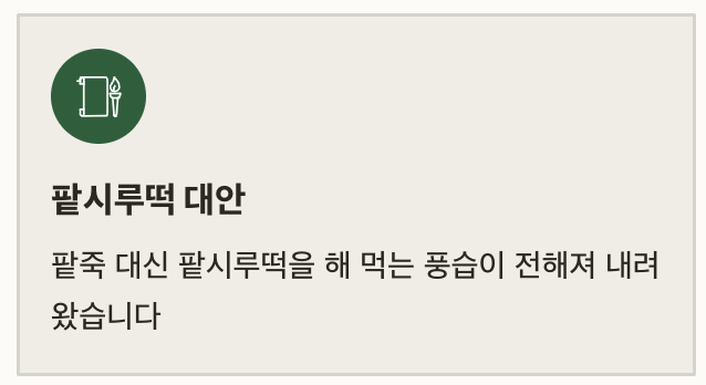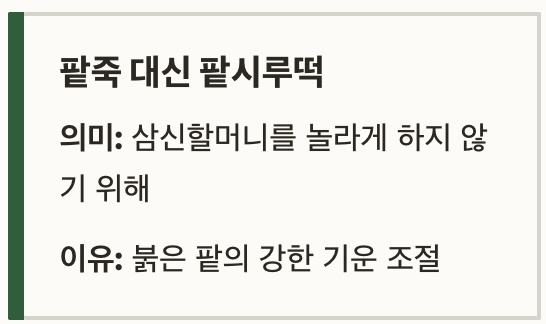 | 팥죽 대신 팥시루떡 | 삼신할머니를 놀라게 하지 않기 위해 | 붉은 팥의 강한 기운 조절 |