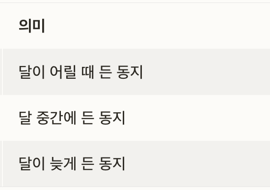| 애기동지 | 달이 어릴 때 든 동지 | 11월 1일 ~ 10일 |