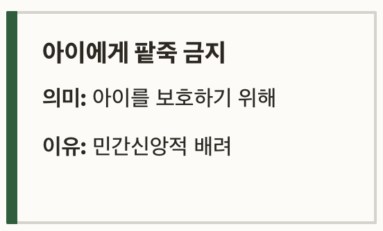 | 아이에게 팥죽 금지 | 아이를 보호하기 위해 | 민간신앙적 배려 |
