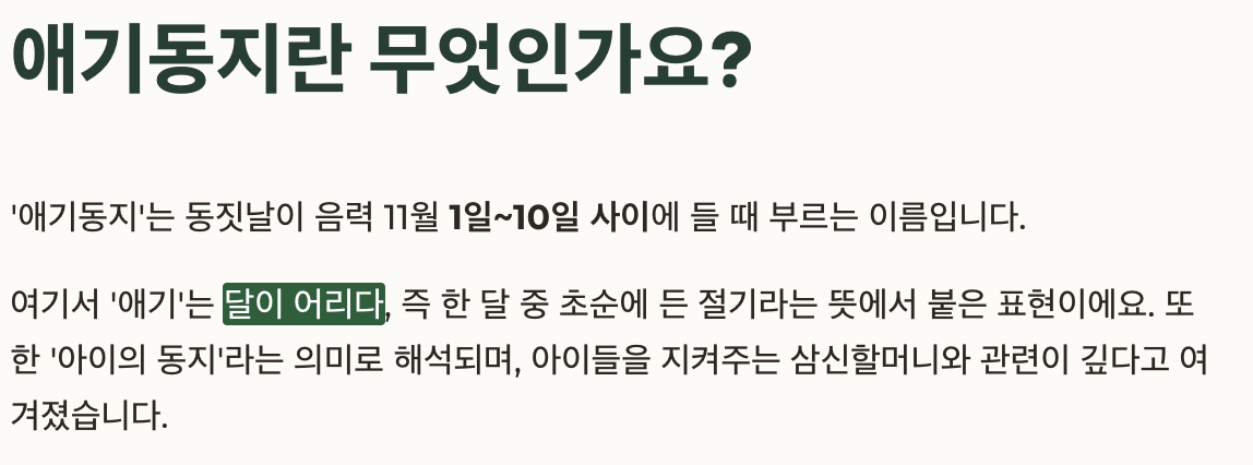 ‘애기동지’는 동짓날이 음력 11월 1일~10일 사이에 들 때 부르는 이름입니다.