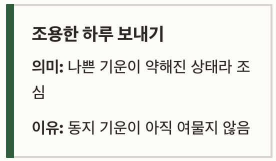 | 조용한 하루 보내기 | 나쁜 기운이 약해진 상태라 조심 | 동지 기운이 아직 여물지 않음 |