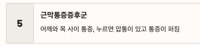 | 근막통증증후군 | 어깨와 목 사이 통증, 누르면 압통이 있고 통증이 퍼짐 |