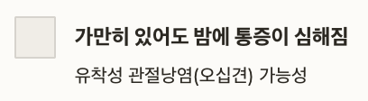 | 가만히 있어도 밤에 통증이 심해짐 | 유착성 관절낭염(오십견) 가능성 |