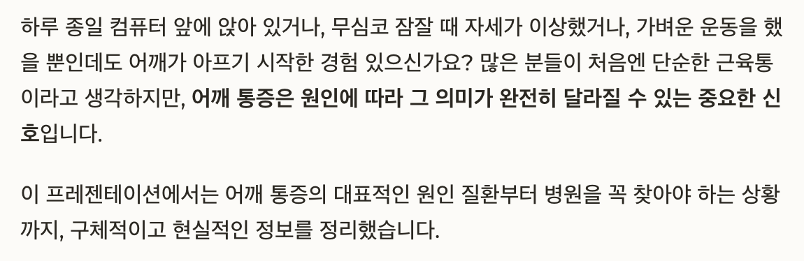 많은 분들이 처음엔 단순한 근육통이라고 생각하지만, 어깨 통증은 원인에 따라 그 의미가 완전히 달라질 수 있는 중요한 신호입니다.