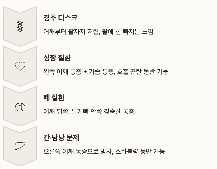 특히 목 디스크나 내부 장기 이상이 어깨 통증으로 연결되는 경우가 존재합니다.