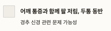 | 경추 디스크 | 어깨부터 팔까지 저림, 팔에 힘 빠지는 느낌 |