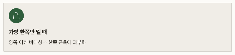 | 가방 한쪽만 멜 때 | 양쪽 어깨 비대칭 → 한쪽 근육에 과부하 |