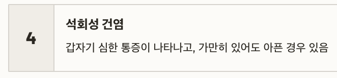 | 석회성 건염 | 갑자기 심한 통증이 나타나고, 가만히 있어도 아픈 경우 있음 |