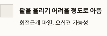 | 회전근개 손상 | 팔을 들어올리기 어렵고, 특정 각도에서 통증이 심해짐 |