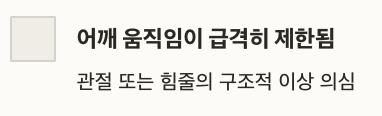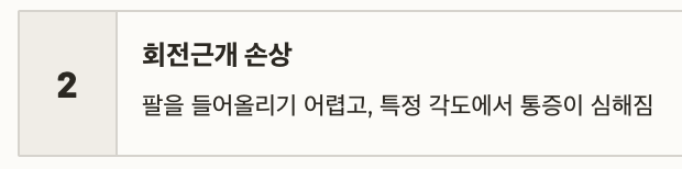 | 어깨 움직임이 급격히 제한됨 | 관절 또는 힘줄의 구조적 이상 의심 |