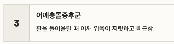 | 어깨충돌증후군 | 팔을 들어올릴 때 어깨 위쪽이 찌릿하고 뻐근함 |
