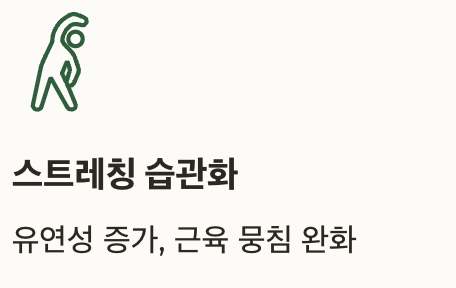 | 스트레칭 습관화 | 유연성 증가, 근육 뭉침 완화 |