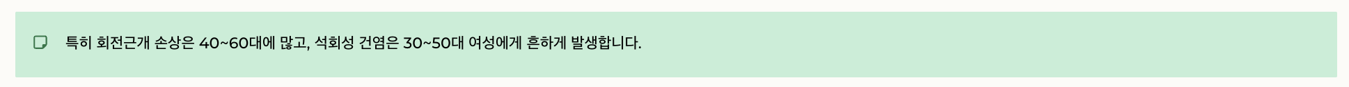 특히 회전근개 손상은 40~60대에 많고, 석회성 건염은 30~50대 여성에게 흔하게 발생합니다.