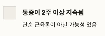 | 통증이 2주 이상 지속됨 | 단순 근육통이 아닐 가능성 있음 |