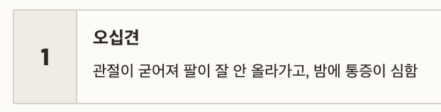 | 오십견 | 관절이 굳어져 팔이 잘 안 올라가고, 밤에 통증이 심함 |