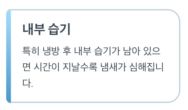 특히 냉방 후 내부 습기가 남아 있으면 시간이 지날수록 냄새가 심해집니다.