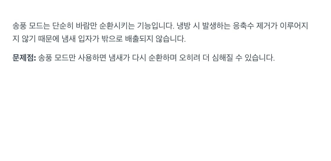 송풍 모드 사용 시 반드시 창문을 열어 외부 공기와 함께 환기해야 합니다.