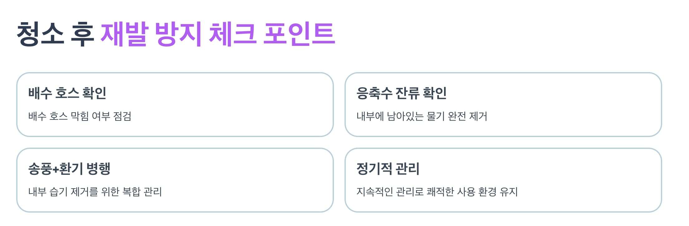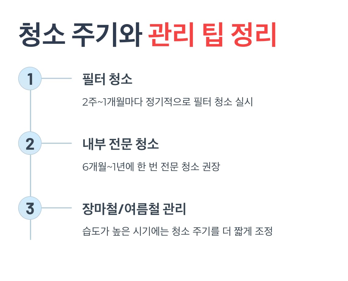 청소 후 냄새가 재발하면 배수 호스 막힘이나 응축수 잔류 여부를 확인해야 합니다.