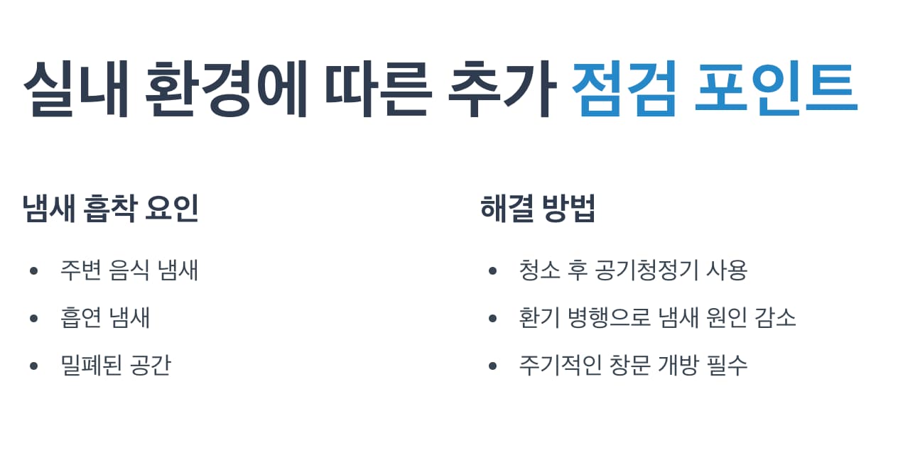 이 경우 청소 후 반드시 공기청정기와 함께 환기를 병행해 냄새 원인을 줄여야 합니다.