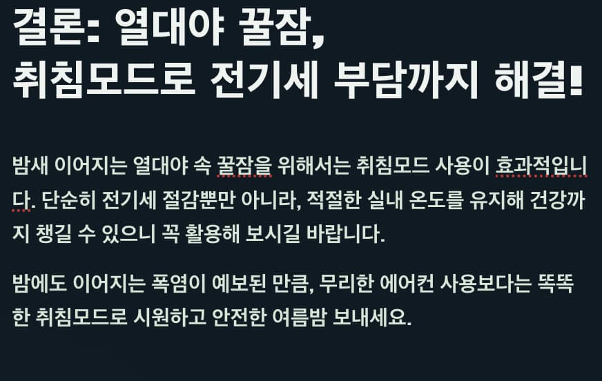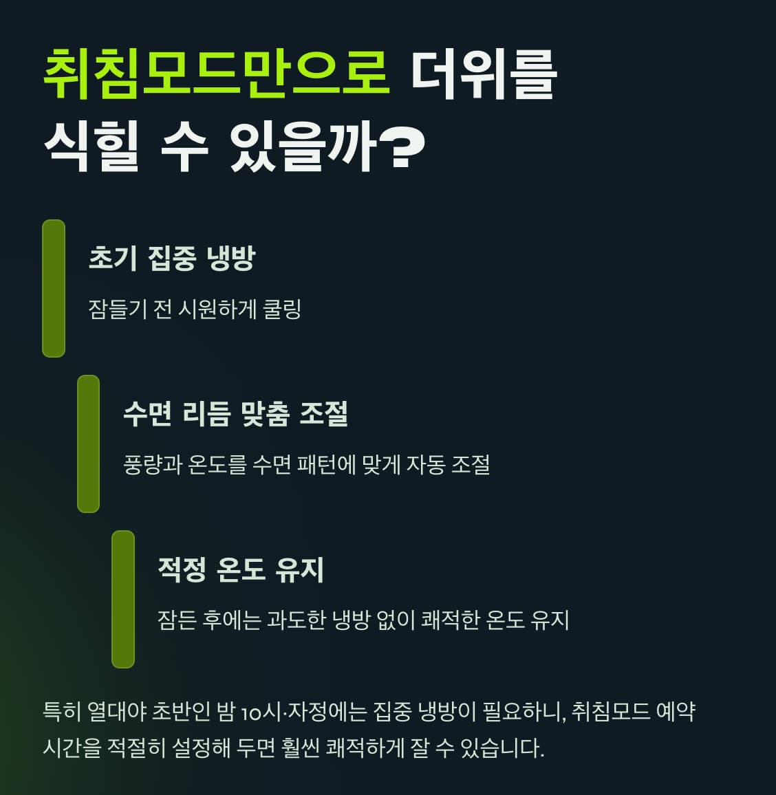 무리한 에어컨 사용보다는 똑똑한 취침모드로 시원하고 안전한 여름밤 보내세요.