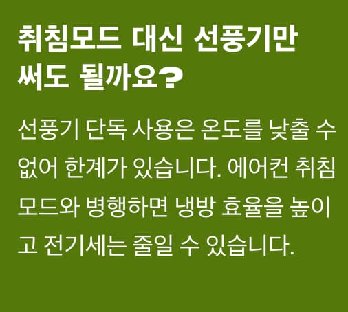 A. 선풍기 단독 사용은 온도를 낮출 수 없어 한계가 있습니다. 에어컨 취침모드와 병행하면 냉방 효율을 높이고 전기세는 줄일 수 있습니다.