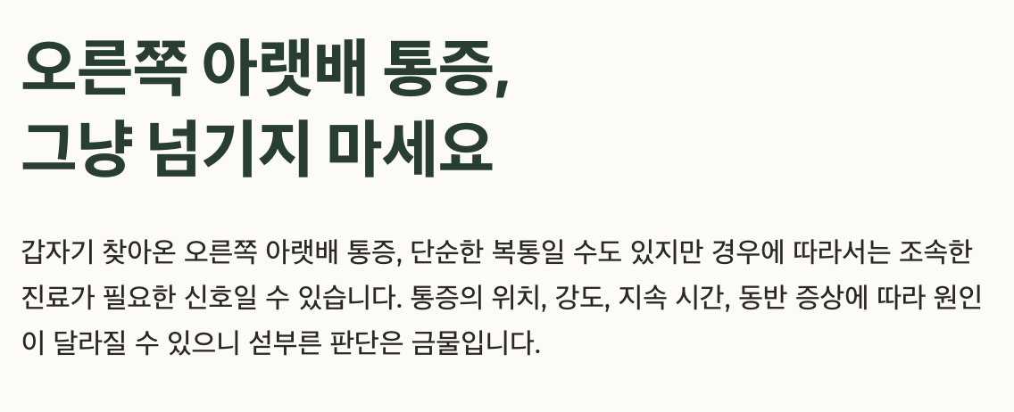 갑자기 찾아온 오른쪽 아랫배 통증, 단순한 복통일 수도 있지만 경우에 따라서는 조속한 진료가 필요한 신호일 수 있습니다. 통증의 위치, 강도, 지속 시간, 동반 증상에 따라 원인이 달라질 수 있으니 섣부른 판단은 금물입니다. 이 글에서는 오른쪽 아랫배 통증의 대표적인 원인과 확인해야 할 증상들을 정리해 드립니다.
