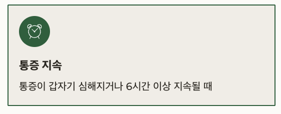 - 통증이 갑자기 심해지거나 6시간 이상 지속될 때