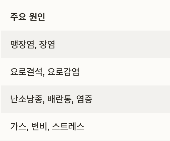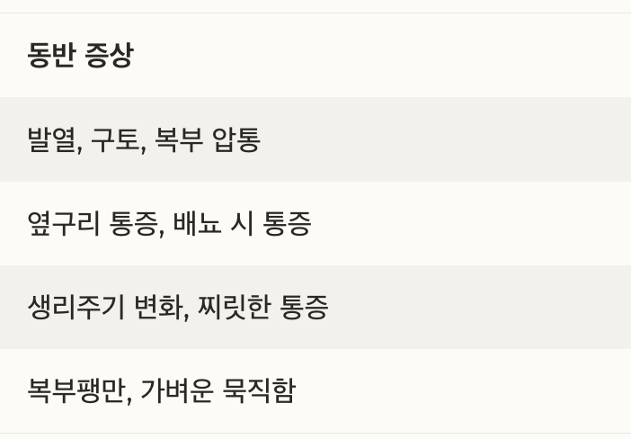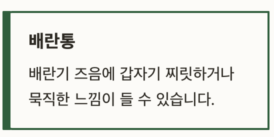 | 기타 | 가스, 변비, 스트레스 | 복부팽만, 가벼운 묵직함 |