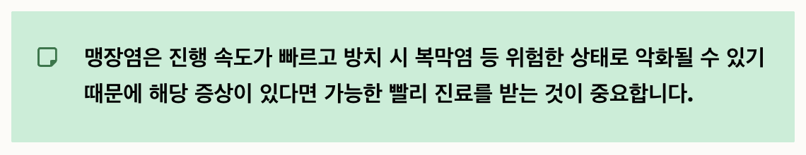 맹장염은 진행 속도가 빠르고 방치 시 복막염 등 위험한 상태로 악화될 수 있기 때문에