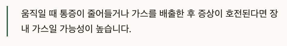 움직일 때 통증이 줄어들거나 가스를 배출한 후 증상이 호전된다면 장내 가스일 가능성이 높습니다.